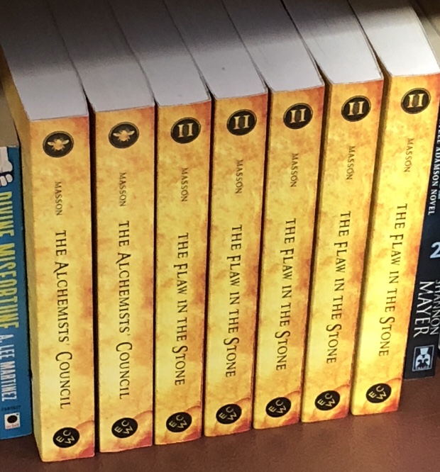 I was particularly happy to hear from Sarah that both The Alchemists’ Counciland The Flaw in the Stone are available through her local branch of the Chicago Public Library. As of today, all copies are still in use; thus, I assume they currently reside either with Sarah or another Chicagoan! Thank you Chicago!