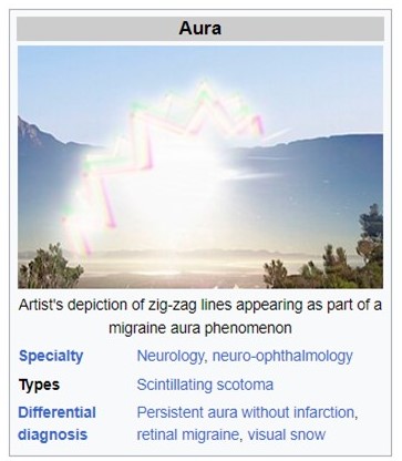 You may recall that I live on Vancouver Island in British Columbia, Canada. Wild fires raged across our province this summer. Smoke continues to linger alongside the provincial state of emergency. The “[a]rtist’s depiction” in the Wikipedia image above is an uncannily accurate replica of my migraine-induced vision. Simply relace the haze across the water with smoke across the mountains, and you’ll see as I currently see.